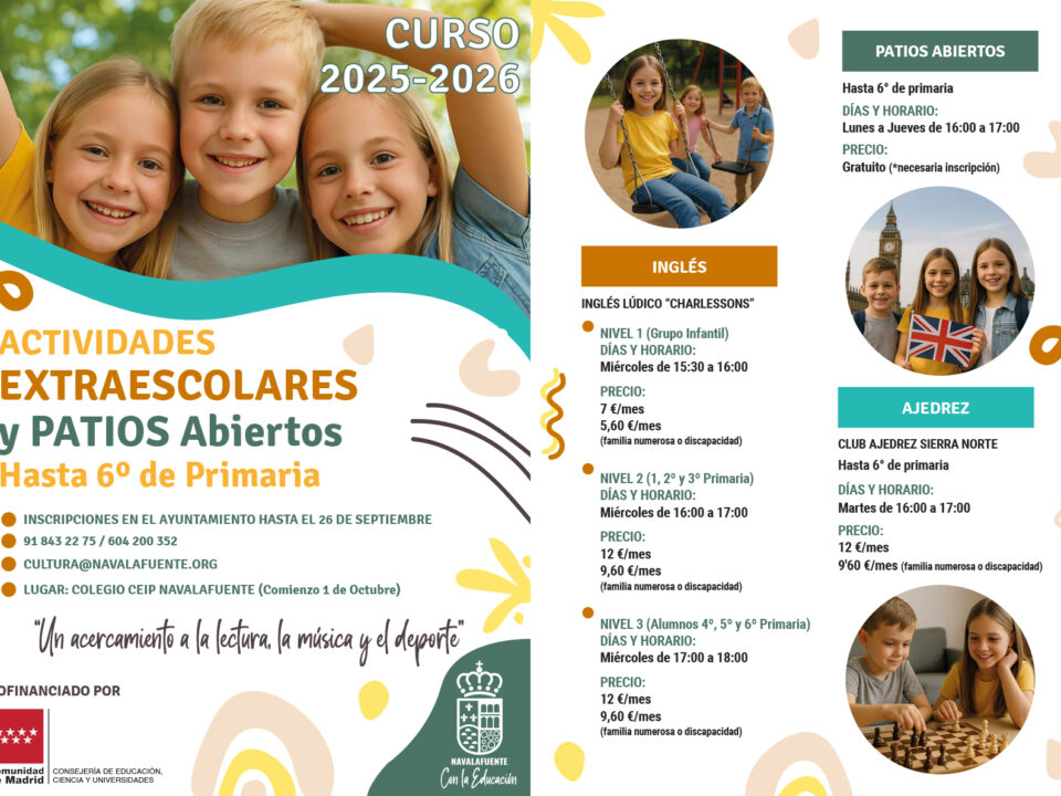 CEIP NAVALAFUENTEApertura de colegio en día no lectivo 🗓️ Fecha: 13 de octubre📝Plazo de inscripciones: hasta el día 9 en el Ayuntamiento de Navalafuente🕙Horario: de 10 […]EVOLUCIONA: MUJERES CON MENTALIDAD GANADORA