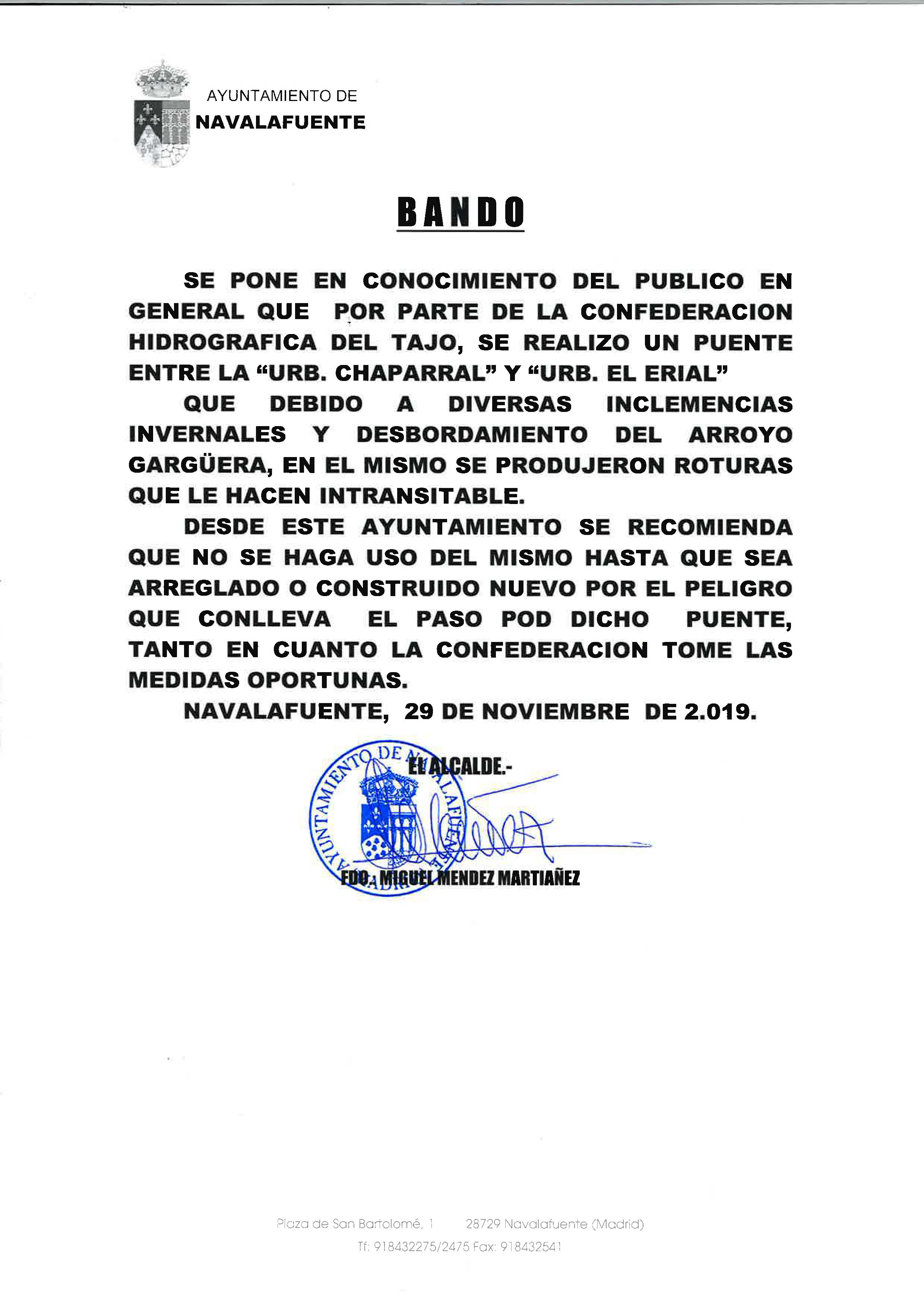 El Alcalde Presidente de este Ayuntamiento dictó un bando el pasado 29 de noviembre, relativo a la la recomendación de no usar el puente que une las urbanizaciones del Erial y el Chaparral, cuyo contenido se puede consultar aquí: