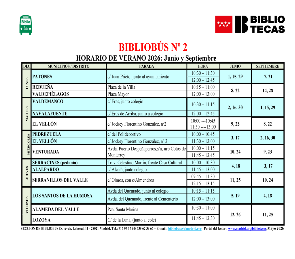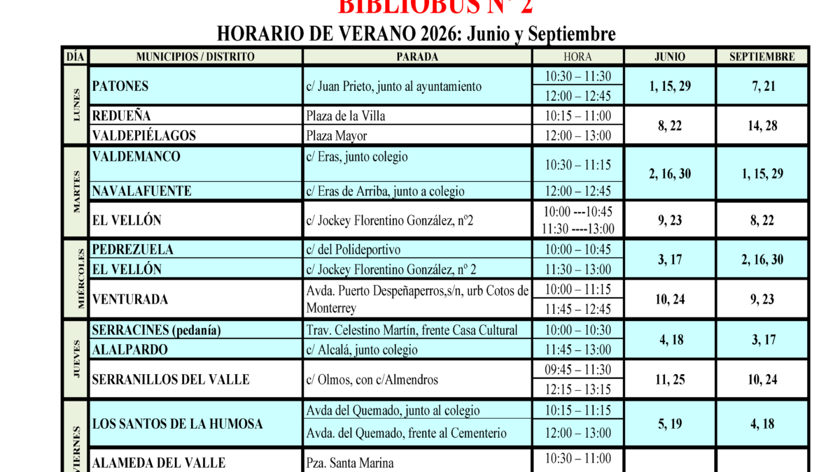 El Ayuntamiento de Navalafuente informa a la ciudadanía de que el servicio de Bibliobús Nº 2 dispone ya de su horario de verano, que estará vigente durante los meses de junio y septiembre.
