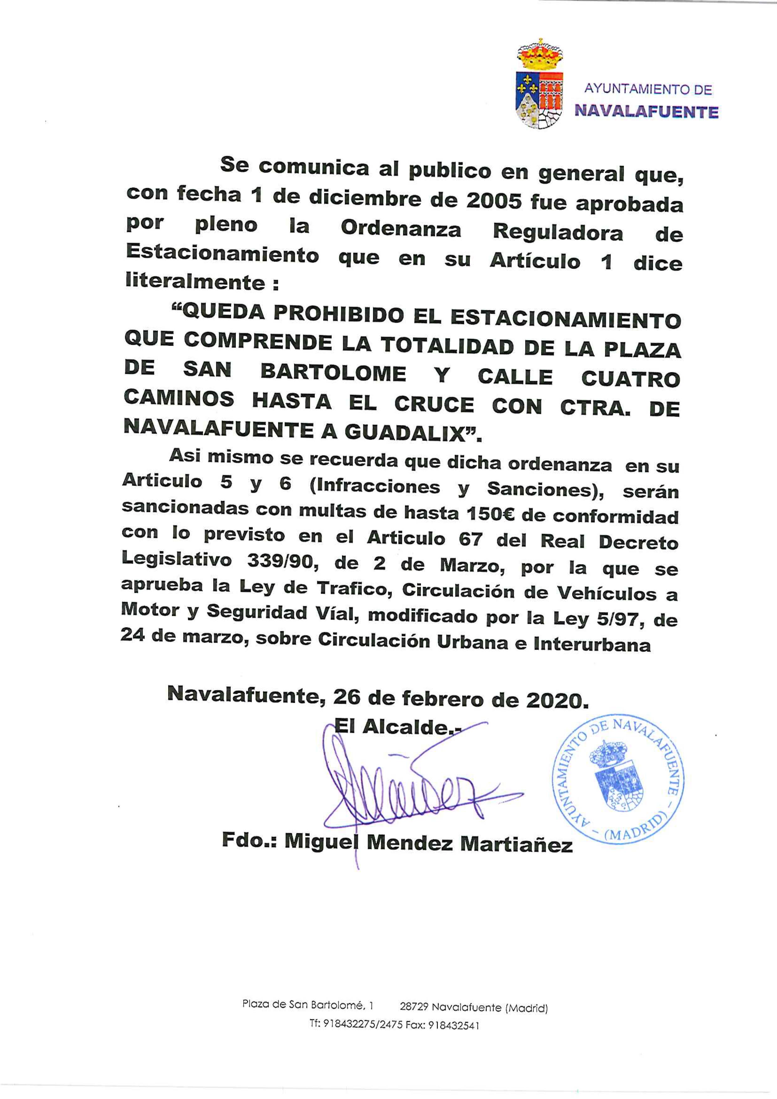 Comunicado sobre la prohibición de aparcar en Plaza de San Bartolomé y Calle Cuatro Caminos