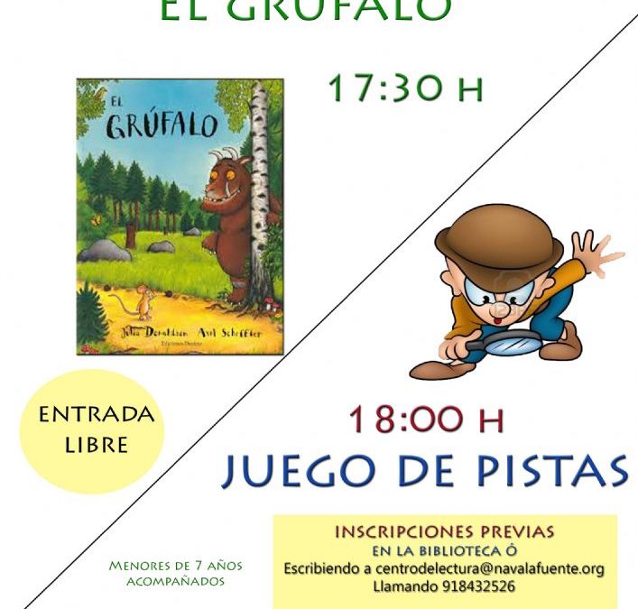 Este próximo lunes 23 de abril, con motivo de la celebración del día del libro, contaremos en la biblioteca el cuenta cuentos "El grúfalo" a las 17:30 h, y a las 18:00 h se realizará un "Juego de pistas" , al que los menores de 7 años deberán acudir acompañados.