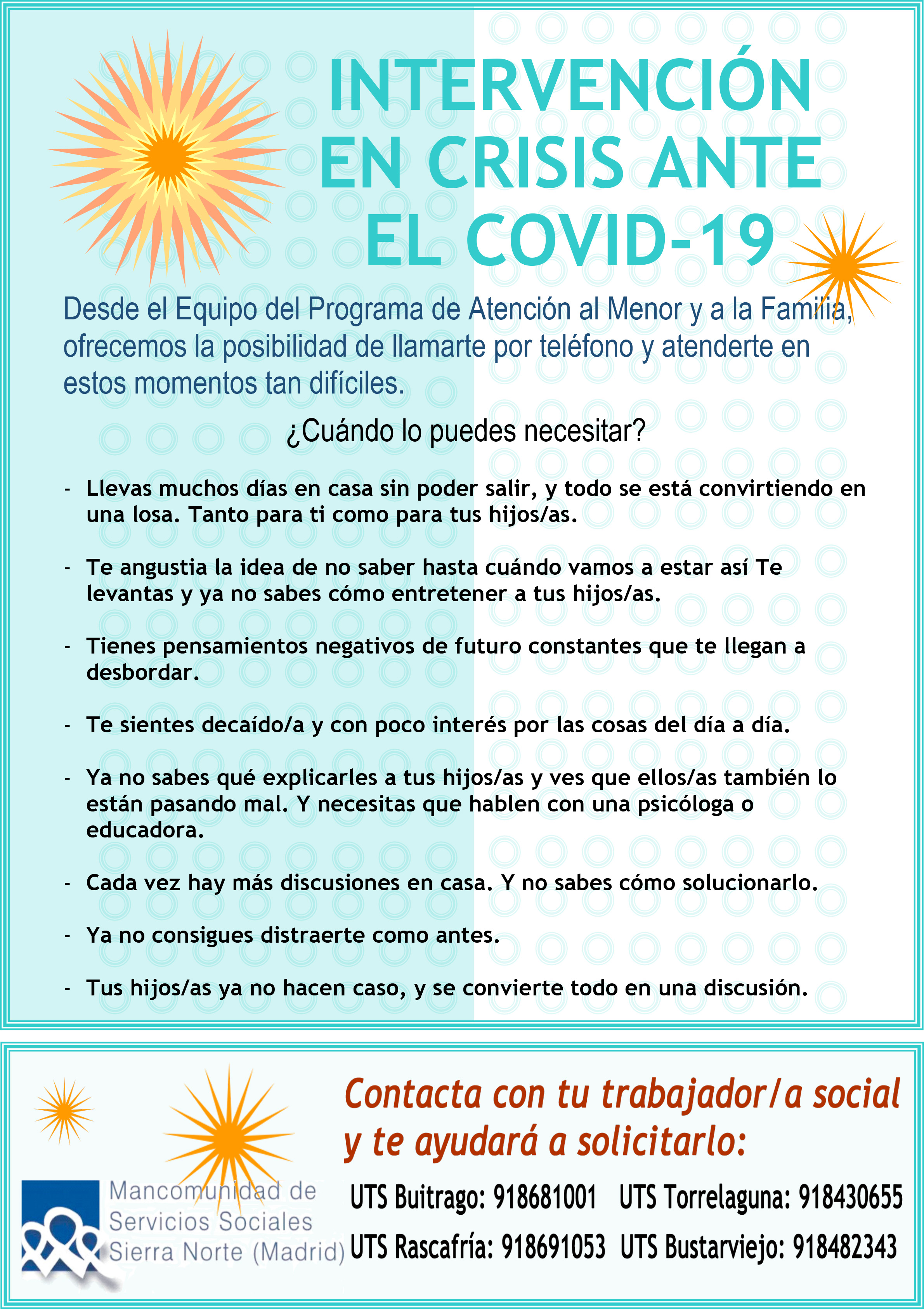 Desde el equipo del programa de atención al menor y la familia de la Mancomunidad de Servicios Sociales Sierra Norte, ofrecen la posibilidad de llamar por teléfono y atenderte en momentos tan difíciles.