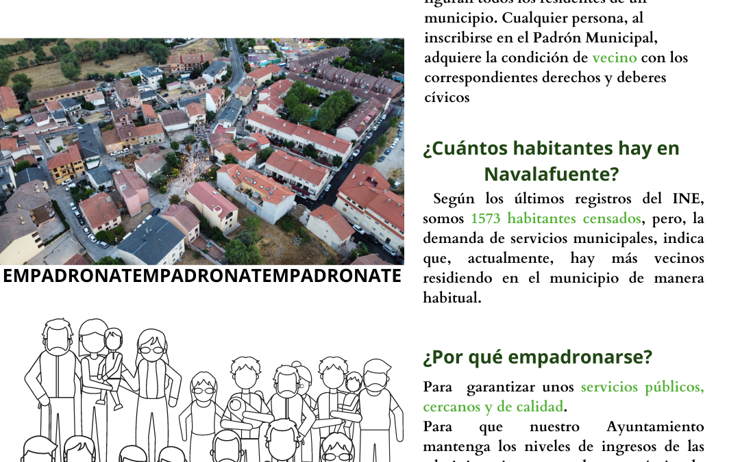 Por cada vecino empadronado, el Ayuntamiento recibe del Gobierno de España una cantidad de dinero que se utiliza para servicios públicos, como alumbrado, mantenimiento de calles, caminos y carreteras, asistencia social, seguridad, protección civil… Estos últimos años, Navalafuente ha visto incrementada su población. Debido a la pandemia, y al aumento del teletrabajo en muchas empresas, la gente ha venido a residir al municipio buscando un entorno privilegiado rodeado de naturaleza. Sin embargo, muchas de esas personas que están residiendo aquí no se encuentran empadronadas, lo que conlleva que el Ayuntamiento no reciba todo el dinero que le corresponde y, por tanto, no pueda ofrecer los servicios y recursos acordes con la población real.