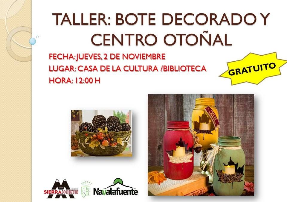 Jueves 2 de noviembre a las 12:00 h en la casa de cultura. Este jueves a partir de las 12:00 h en la Casa de Cultura municipal te enseñaremos a decorar botes y centros con motivos otoñales.