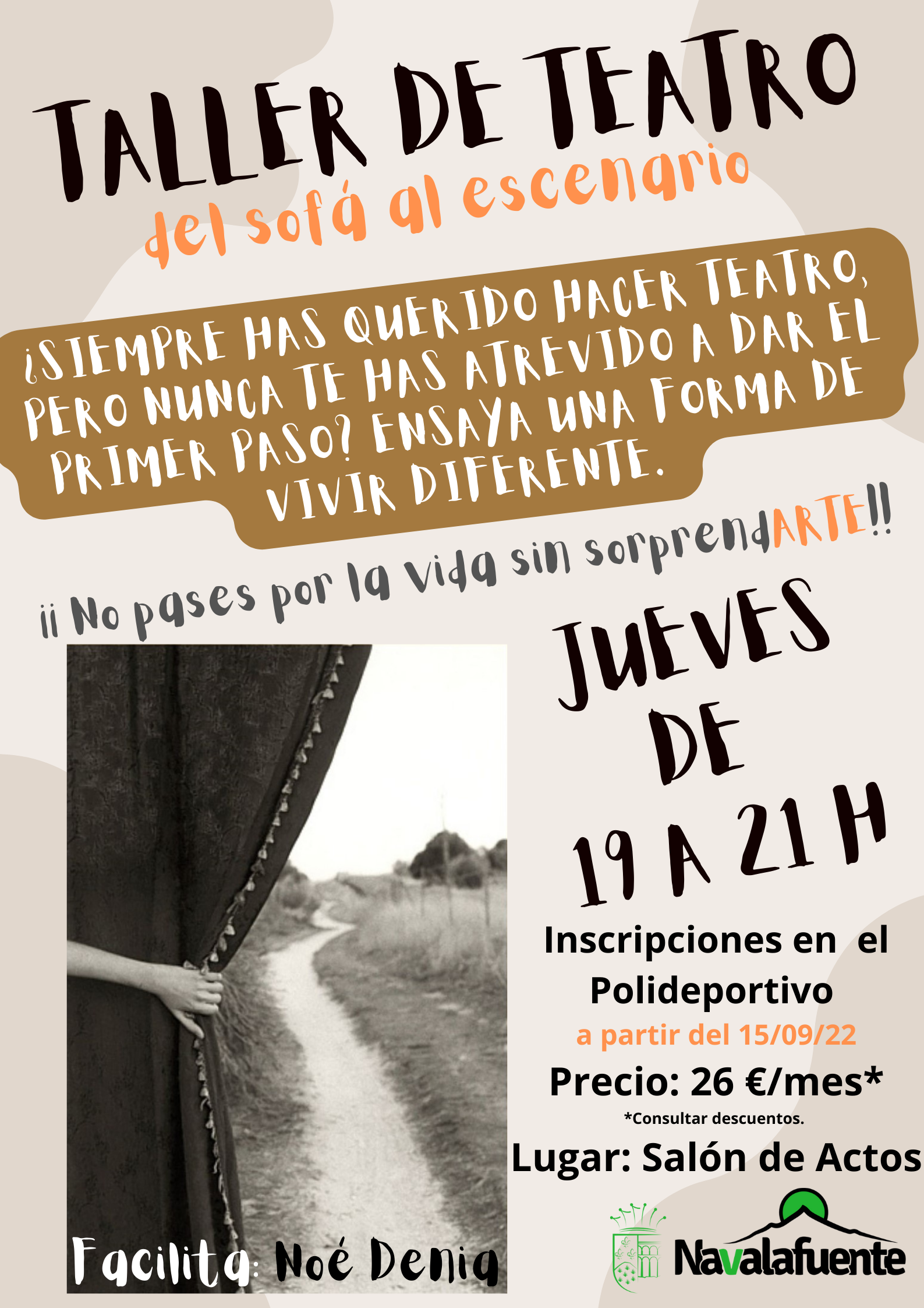 La concejalía de participación social y cultura ha organizado un taller de teatro que se llevará a cabo los jueves de 19:00 a a 21:00 h, en el salón de actos municipal de Navalafuente, impartidas por Noé Denia.